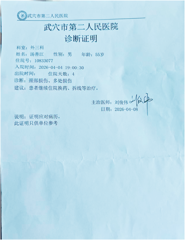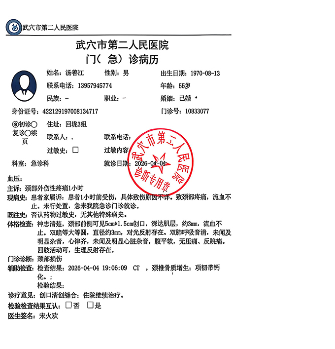 据现场目击者和医院诊断证明,汤善江老人面颈、耳部、喉咙多处开放性伤口,鲜血浸透衣物,生命体征危急。