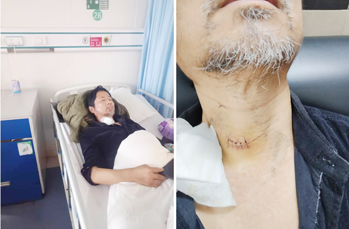 经武穴市第二医院急诊科诊断,老人存在喉部切割伤(深度达2cm,喉部单一长度达5cm)、面部裂伤、耳廓部分离断伤、多发性软组织挫伤,目前仍在ICU抢救,随时可能因失血性休克或感染危及生命。